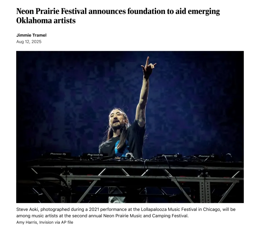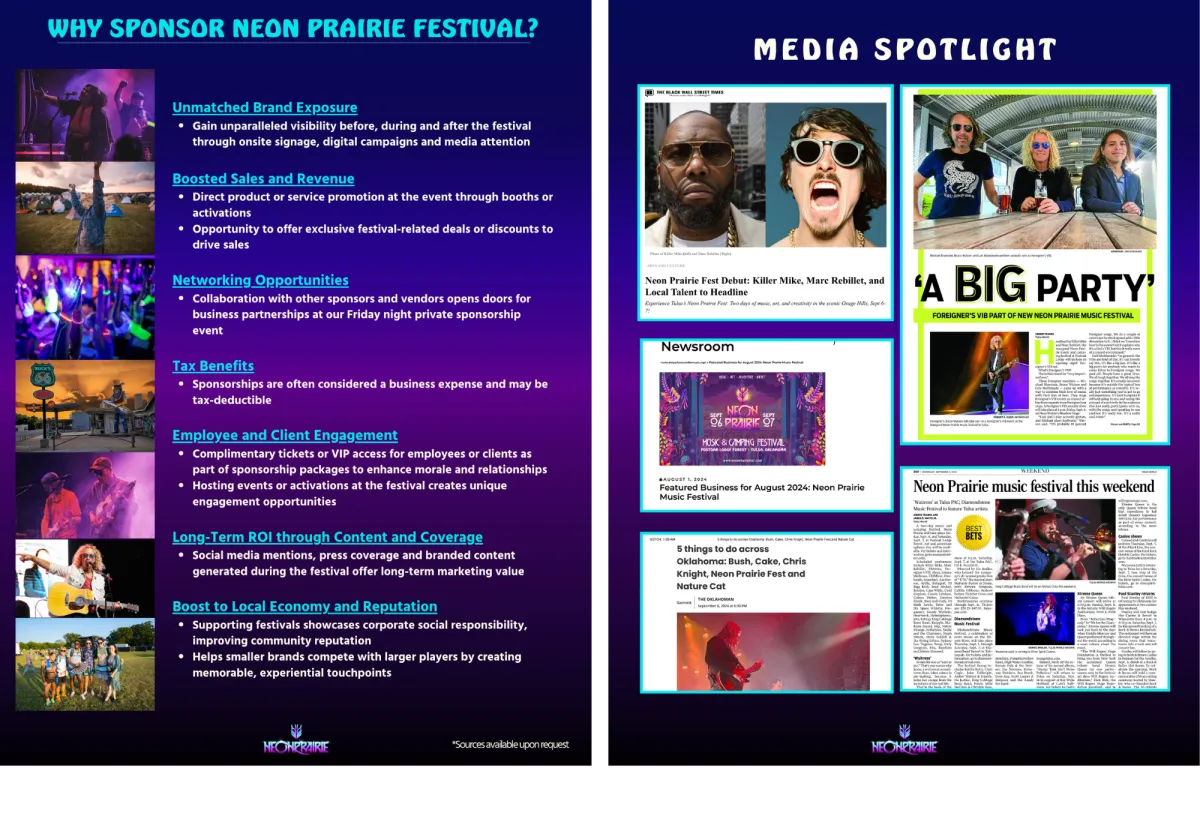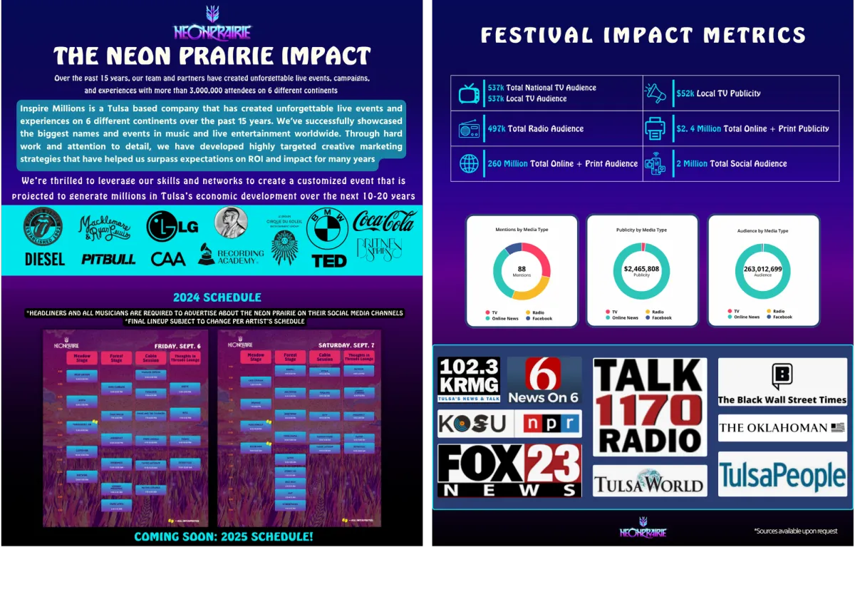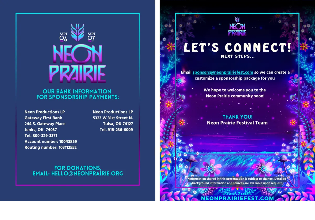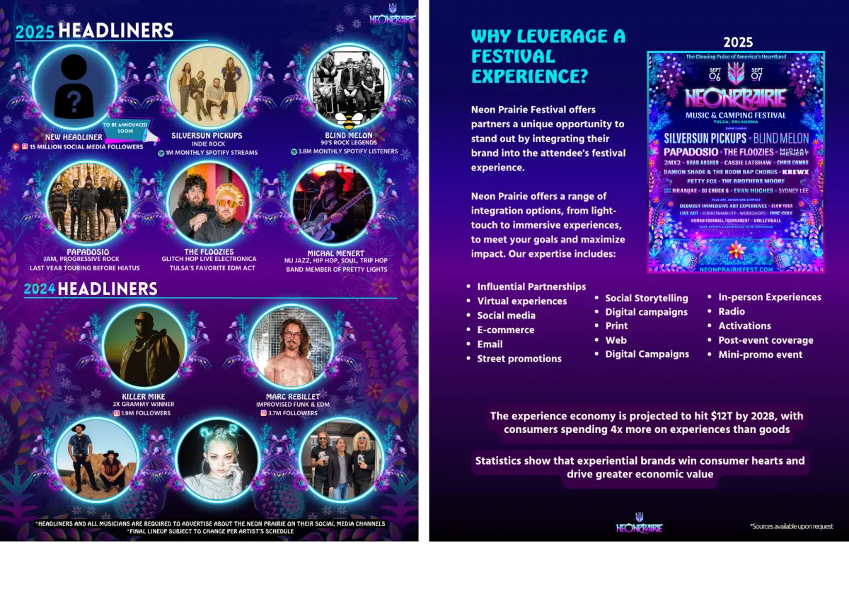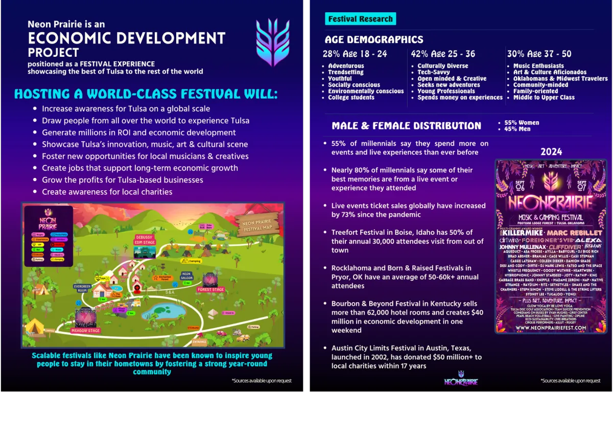 Neon Prairie is a landmark cultural project that's poised to be a top driver of economic growth, tourism, and job creation in Tulsa and the Midwest. It’s more than a festival—it’s a world-class experience designed to elevate the region’s creative economy and put Tulsa on the map. Your support fuels real impact by supporting local musicians, artists, and driving dollars into businesses and surrounding communities. By backing Neon Prairie, you’re leading this movement and a vision for our future that blends culture, community, and commerce.
