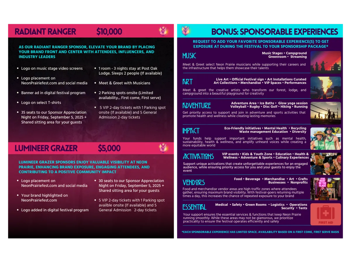 Every Neon Prairie sponsorship package includes tickets to the Sponsorship